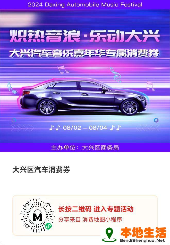 本次“大兴区2024汽车音乐嘉年华”活动于2024年08月02日-2024年08月04日期间举办,消费券有效期截至2024年08月04日24时(额度先行用完或时间到期后截止)。