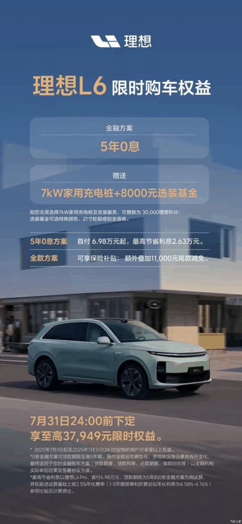 理想发布7月购车权益 L6享5年0息 首付6.98万起 享保险补贴1.1万