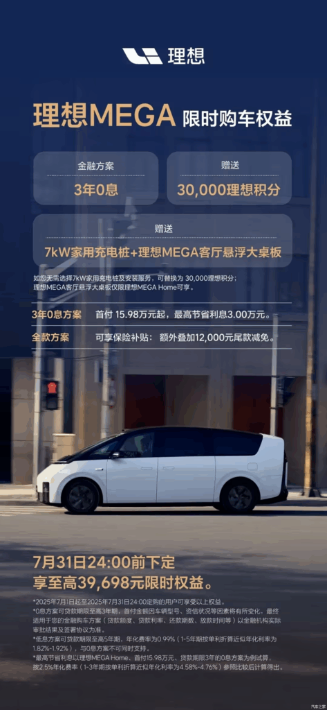 理想MEGA贷款购车享3年0息或5年超低息,首付15.98万元起,最高节省利息30,000元;全款购车享保险补贴12000元尾款减免;7kW家用充电桩及安装服务或30000理想积分(二选一),最高价值3699元;30000理想积分,价值3000元;理想MEGA客厅悬浮大桌板,价值2999元(理想MEGA Home可享)。