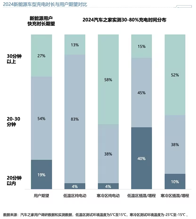 根据汽车之家的用户调研数据,纯电动车用户对于续航里程的期望集中在500-600km,这一比例达到了50%。如上文所述,汽车之家实测中,纯电动车型在低温区的平均续航里程达到了539km,结合用户需求数据来看,当前低温区的实测续航里程基本能够满足主流用户的期待。