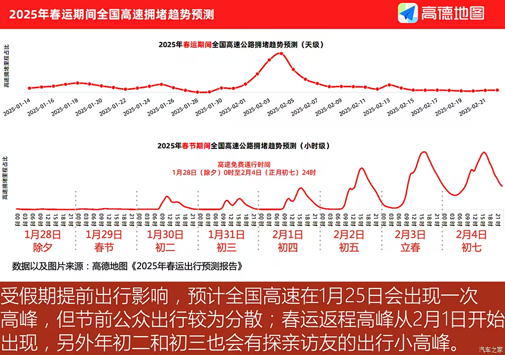 从高德和百度两大地图服务商的数据预测来看,春节假期是路网日均流量最大阶段。对行驶高速公路的七座以下(含七座)小型客车辆实施免费通行政策,车流呈前低后高趋势,假日期间主要以小型客车探亲出行为主,小型客车预计占比达96%,正月初一境内高速车流相对平稳,自正月初二、初三开始,短途探亲车流增长迅猛,主要以各大城市为中心向周边县市、乡镇发散,初六至初七,各县市、乡镇车流向重点城市为中心汇聚,呈现返程高峰,潮汐特征明显。