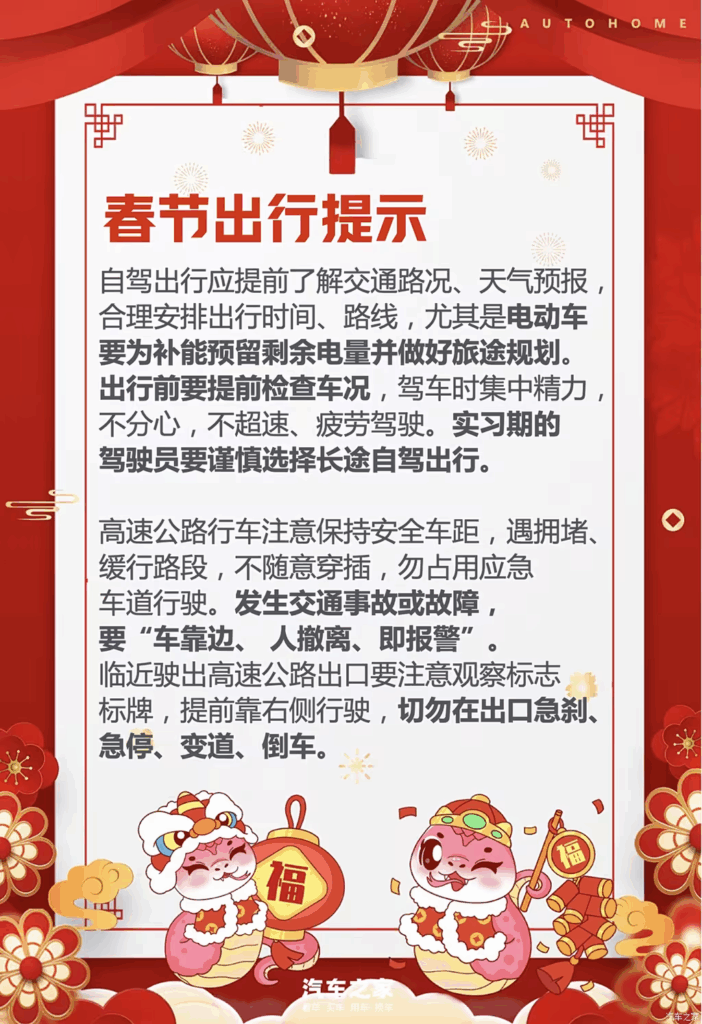 都说过了腊八就是年,随着农历蛇年春节将至,希望大家所到之处都一路畅通,在这里提前祝大家节日愉快!当然了,在全国各地掀起返乡、出行热潮的时候,也希望大家出行时做好充足的准备,平安顺利过好新春佳节。当然了,如果长途自驾之后,春节回家前也要注意检查车辆状况哟!