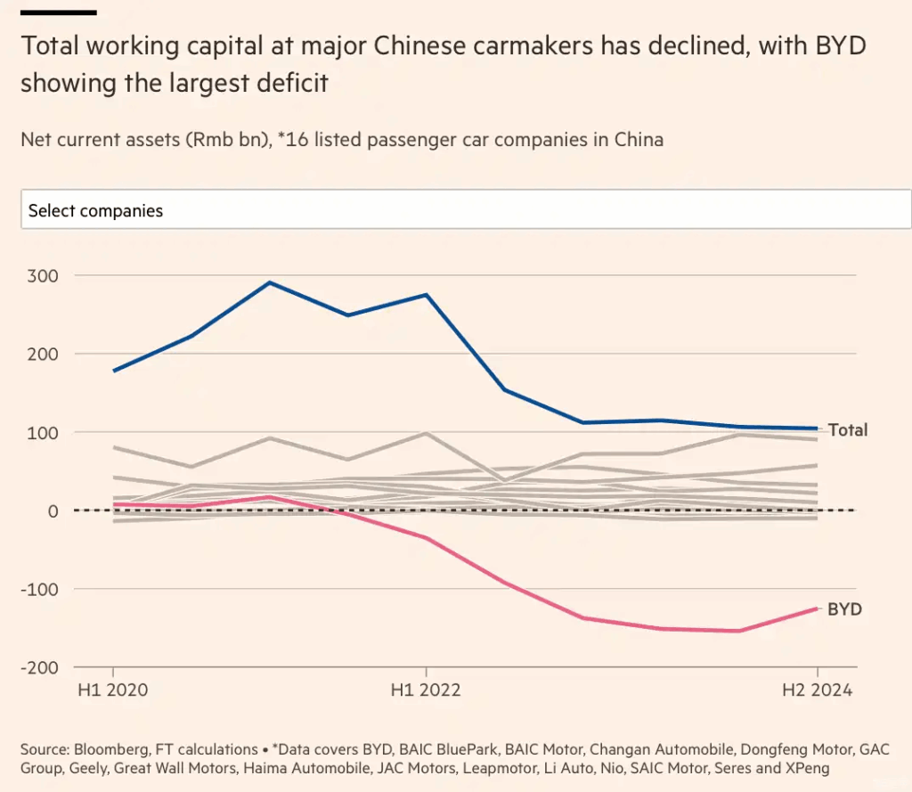 2024年底比亚迪的营运资本赤字扩大到了1254亿人民币,而吉利、蔚来、赛力斯、北汽和江淮的营运资本虽然也有赤字,但加起来只有178亿人民币。