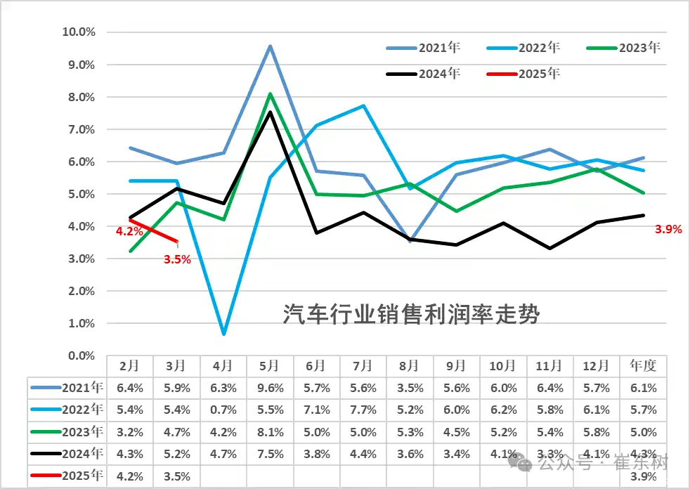 国家统计局5月27日公布的数据显示,2025年前四个月,国内汽车制造行业利润率刚过4%,处于历史低位。2021年至2024年,行业利润率逐年下滑,由6.1%降至4.3%。
